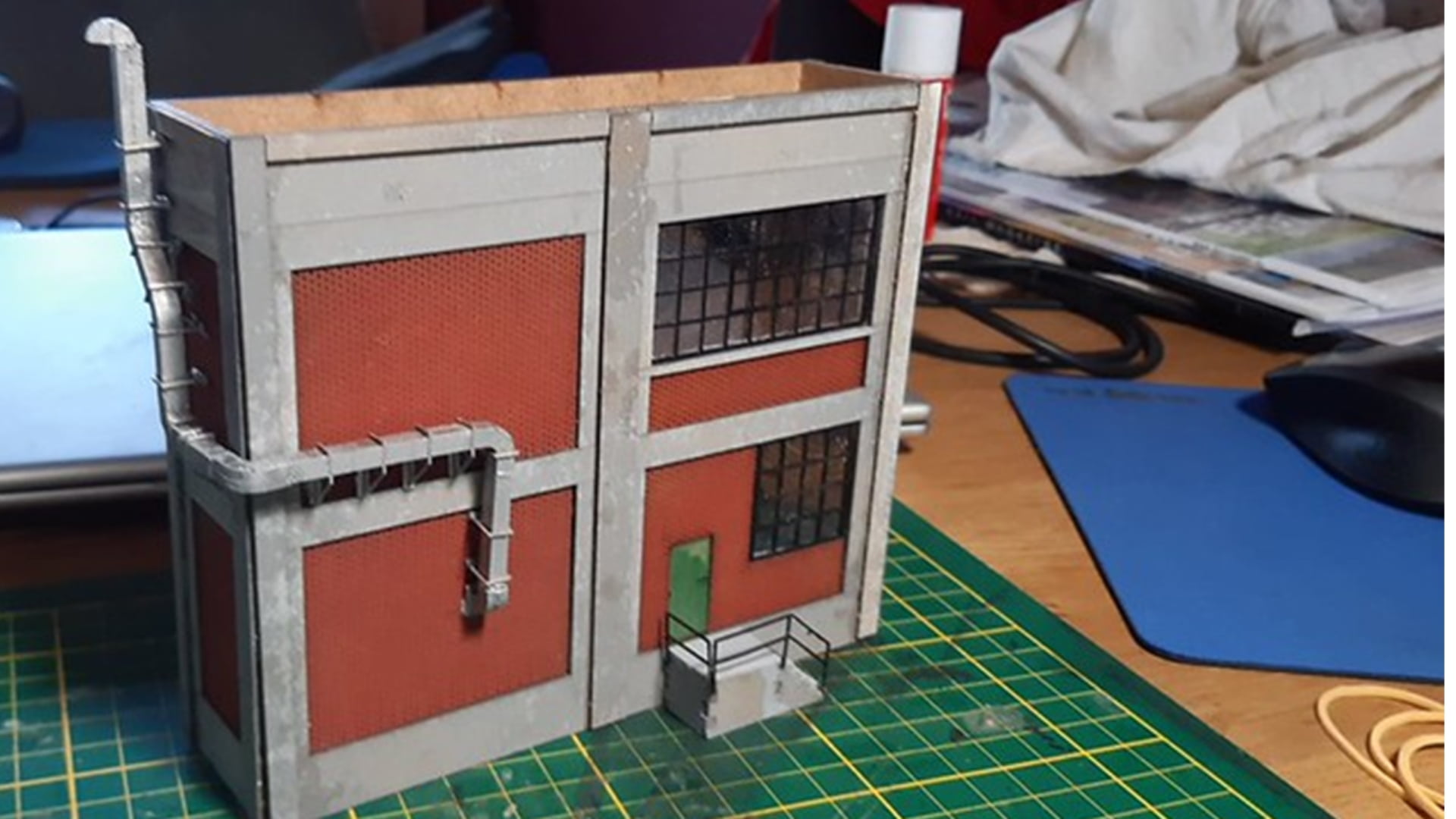 Dit gebouw heb ik gemaakt om eigenlijk alleen de luchtbehandelingskanalen te testen. Dat idee wilde ik testen. Ronald H heeft destijds het gebouwtje gezien en vroeg een 1:48-versie. De bouw daarvan is exact hetzelfde alleen dan een paar maten groter: Portland ID, OR; een 2-turnout Inglenook door Ronald. Het gebouw lijkt ontzettend Noord-Amerikaans maar ga je in Nederland op diverse plaatsen kijken dan zal je deze vorm van bouwen ook tegenkomen. Dit omdat het veel in de jaren 50 en 60 is toegepast. Voor de treintjeliefhebbers: het oude jaren 50 Station Arnhem had dit soort onderdelen.