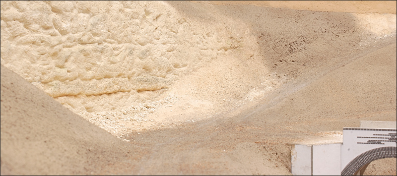 De ballast wordt iets donkerder door het lijmen, maar daar had ik al rekening mee gehouden bij het samenstellen van de mix voor de ballast. Links op de foto met lijm, en rechts zonder lijm.
