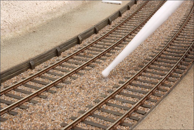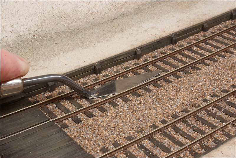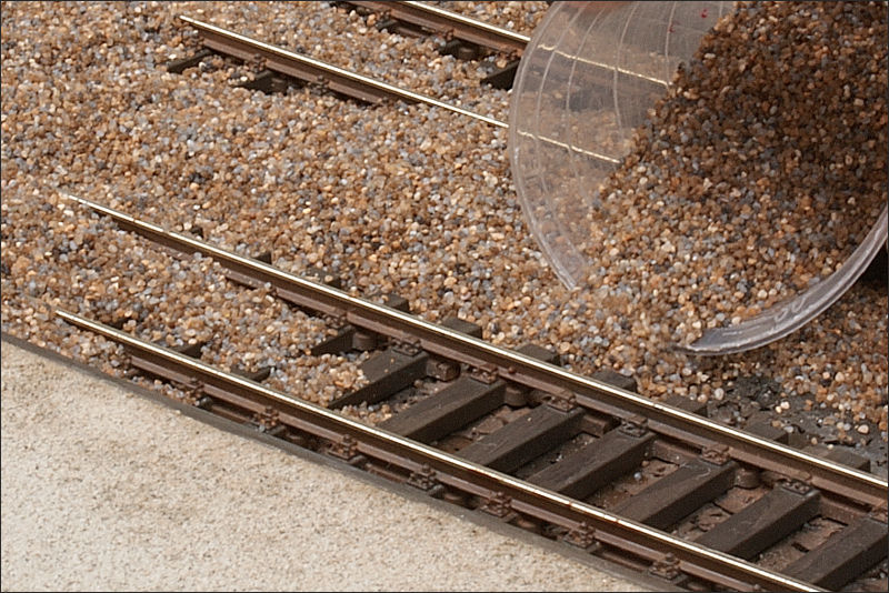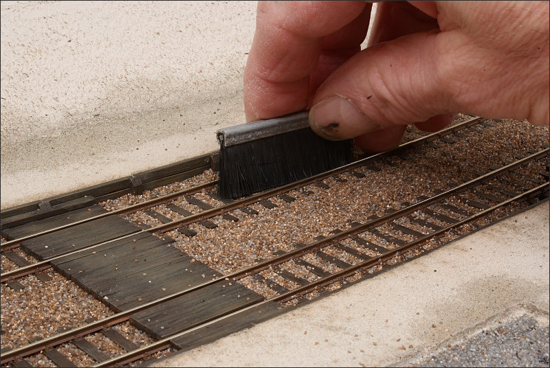 Ik heb steeds 15-20 cm ballast gestrooid en vervolgens met een borstel verdeeld, anders is het moeilijk om overtollig ballast weg te vegen. Met een paar paletmessen is het grind aangedrukt, en met een klein penseeltje is het overtollige grind verwijderd.