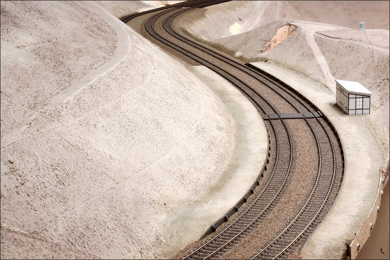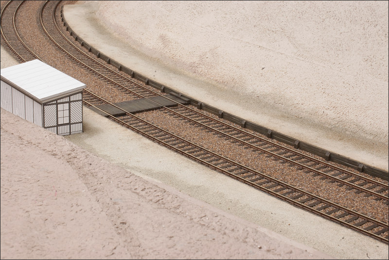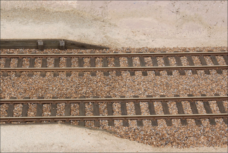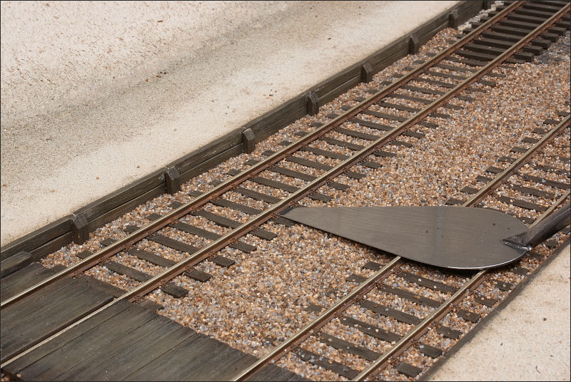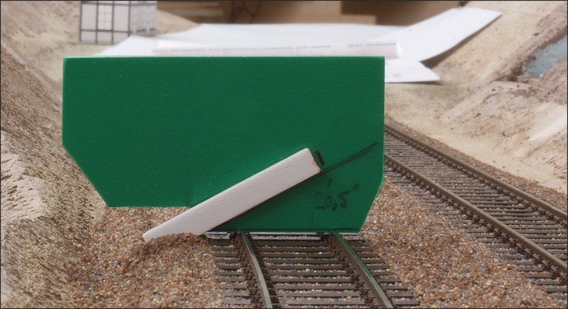 Om de juiste helling van het ballastbed te maken heb ik een kleine mal gemaakt die ik over de rails schuif. De vorm van het ballastbed is gebaseerd op de profielen voor lokaalspoor uit het Handboek Spoorwegtechniek, en deze wijken dus af van de NEM-norm.