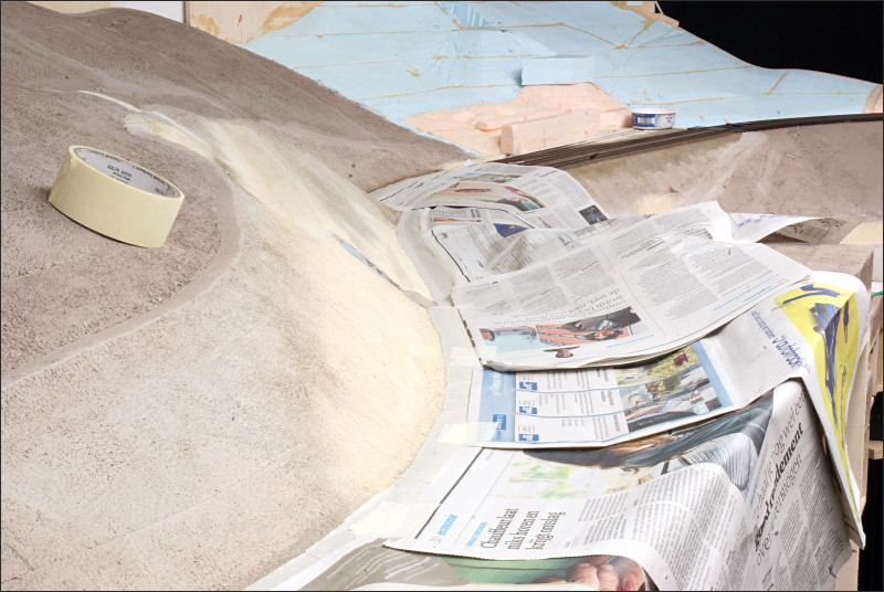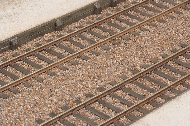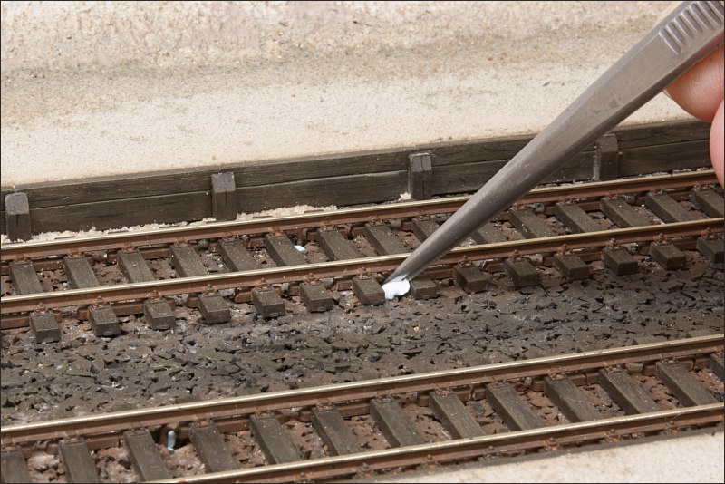 De ballast is verlijmd met een mengsel van 1 deel boekbinderslijm en 3 delen water met een klein scheutje alcohol. Voor het lijmen is de ballast besproeid met een mengsel van alcohol en water in de verhouding 1:10. Eerst heb ik geprobeerd om de lijm aan te brengen met een spuitje. Dat bleek niet werkbaar. Als de spuit iets te hard wordt ingedrukt ontstaat een straaltje in plaats van een druppel, waardoor het grind wordt weggespoten. Uiteindelijk heb ik toch maar een pipet gebruikt, en dat werkt prima.