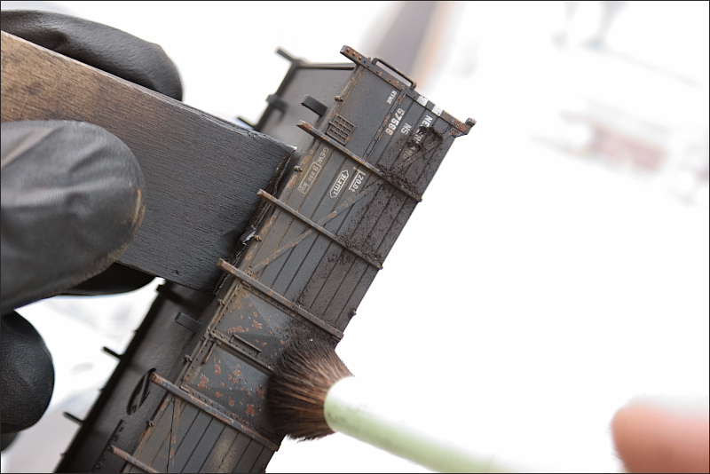 weatheren - pigmenten voor een vervuild uiterlijk van de kolenwagensNa het aanbrengen van corrosie plekken op het metaal en plekken met verweerde verf, ben ik de wagons een meer vervuilt uiterlijk gaan geven met pigment.