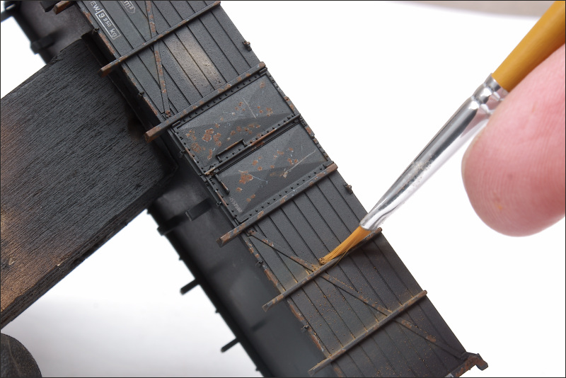 Het eerst heb ik pigment natural umber gebruikt. Langs de stijlen en deuren en op de onderste planken van de wagon heb ik het pigment gebruikt om een laagje vuil te imiteren bij al die delen waar viezigheid kan gaan ophopen gebruikt. Met een klein penseel is het aangebracht, en daarna is het met matte lak verzegeld. Ook hier is het Vallejo pigment handig, er kan bijna niet teveel worden aangebracht.