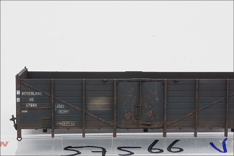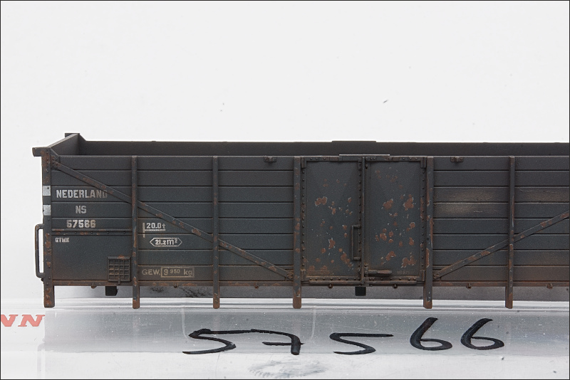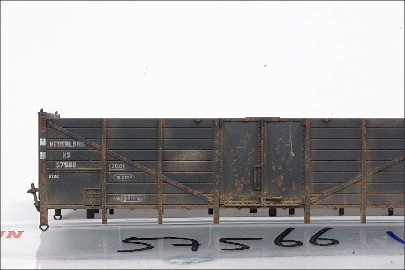 Als laatste heb ik piment track rust gebruikt. Dit spul hecht wel goed, en daar ben ik dus zuinig mee geweest. Ik heb dit langs de onderste rand van de kolenwagens aangebracht, en daarmee sluiten de bakken straks ook weer aan op de onderstellen waar ik hetzelfde pigment heb gebruikt.