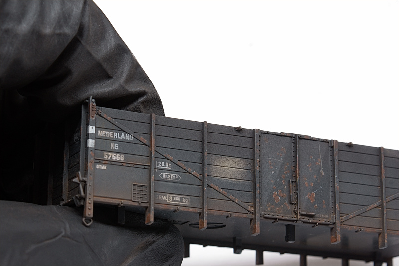 Eerst heb ik een zeer fijne laag vernis gespoten. Met een zachte kwast heb ik het pigment royaal aangebracht en gelijkmatig over de bovenste planken van de wagons verdeeld. Tot slot heb ik het pigment verzegeld met een matte lak. Om een dikkere laag 'kolenstof' aan te brengen kan de behandeling herhaald worden; eerst een nieuwe laag matte lak en dan opnieuw pigment aanbrengen terwijl de lak nog nat is. Dit is voor mij niet nodig, ik vind het prima zo.